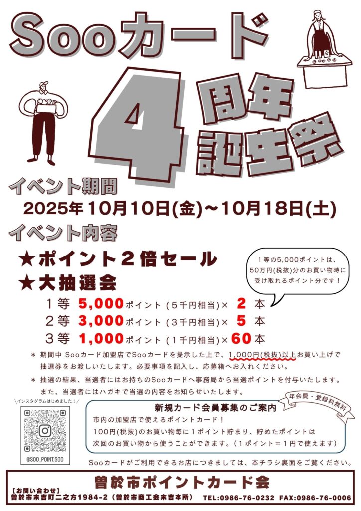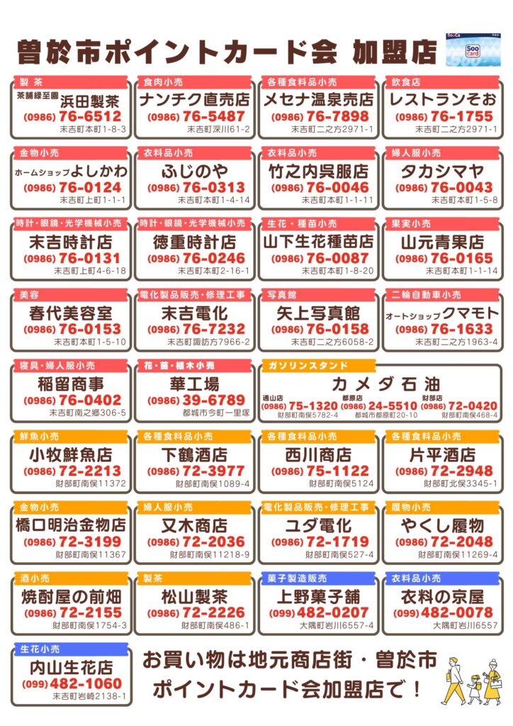 詳しくはチラシ裏面の加盟店、もしくは曽於市商工会までお問い合わせください。