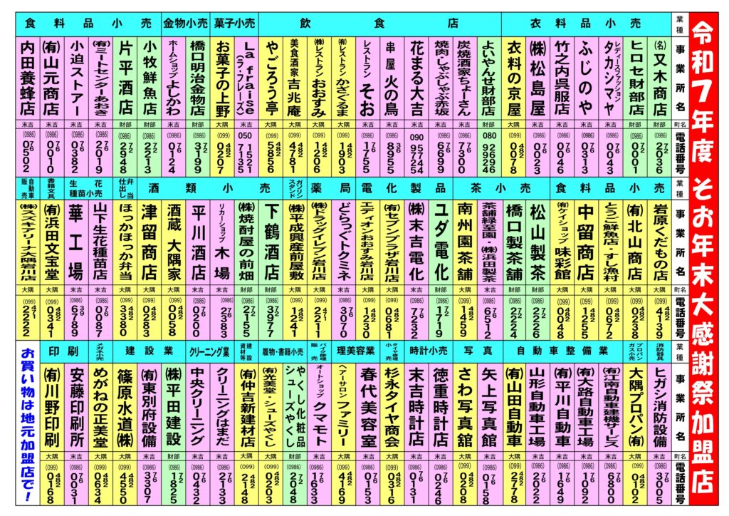 ♦この抽選券は、令和8年1月10日(土) 末吉総合センター で開催されるお楽しみ抽選会の当選番号と一致すると、景品との引き換えができます。引き換えは、曽於市商工会各支所で行えます。(「大隅町スタンプ会商品券」は、大隅支所のみでの引き換えです)