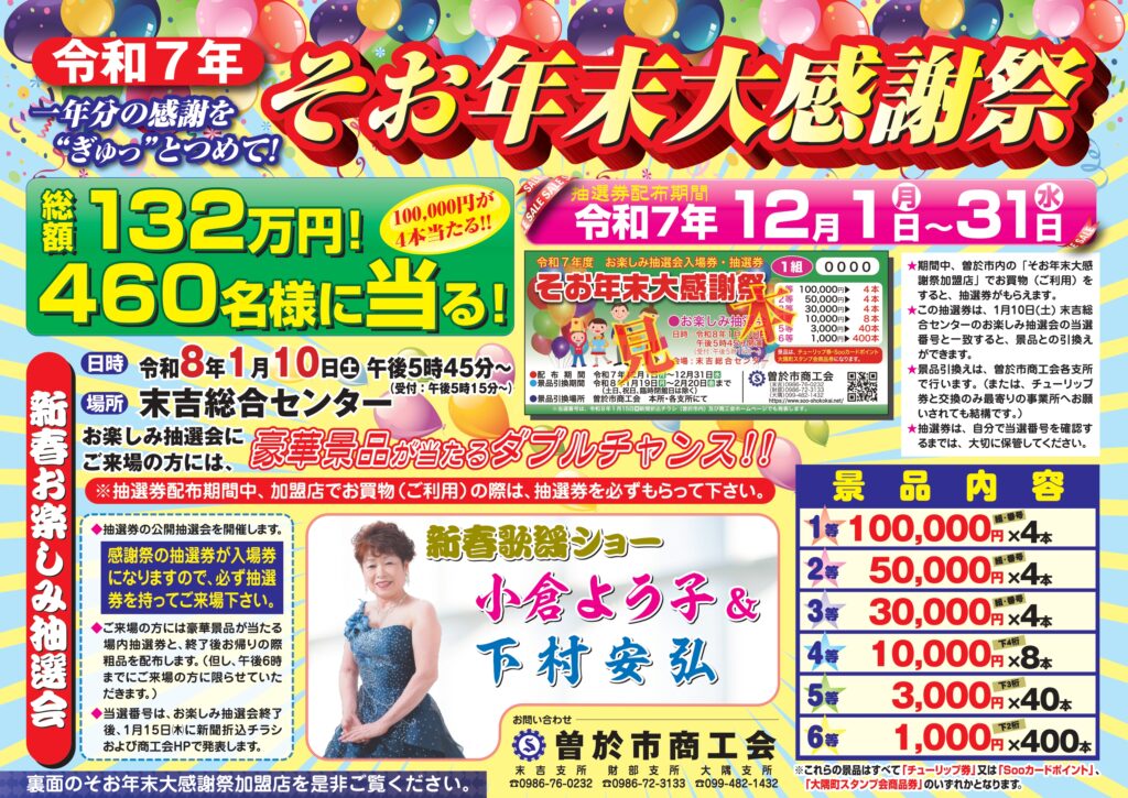 実施期間中、「そお年末大感謝祭加盟店」でお買い物(ご利用)をすると抽選券がもらえます!!