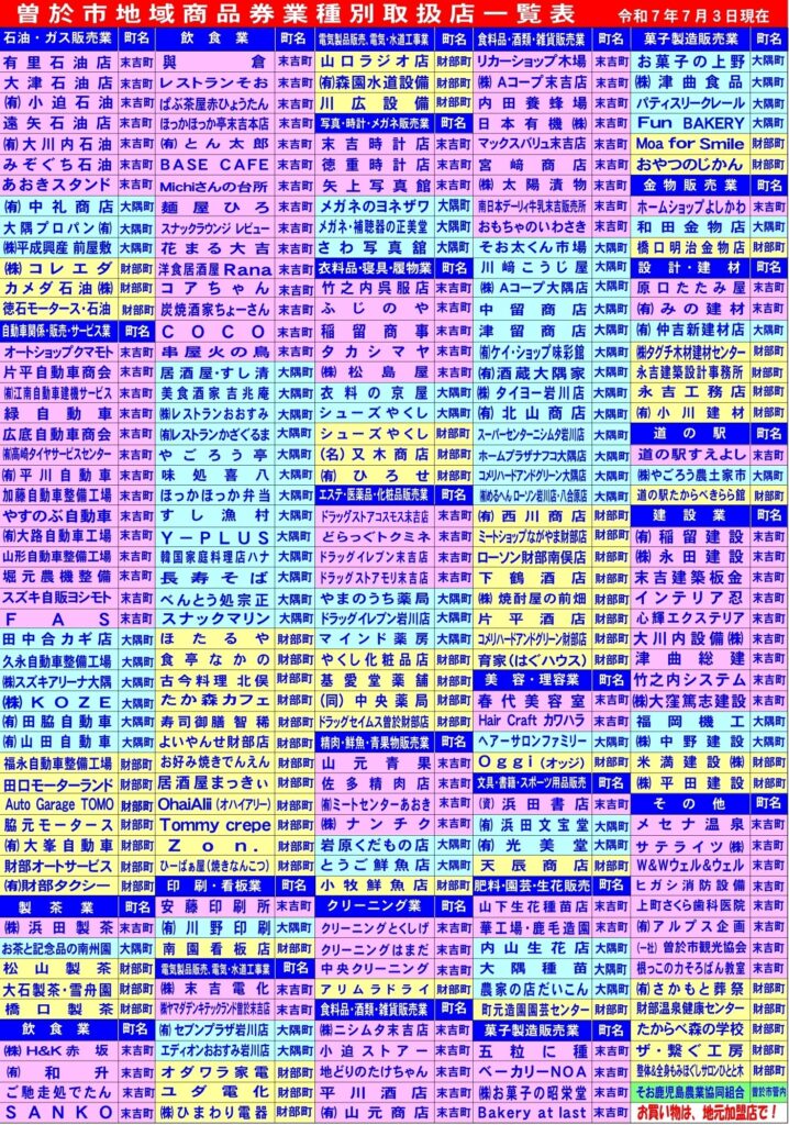 ○ この商品券は曽於市内の取扱店でご利用になれます。詳しくは、「曽於市地域商品券業種別取扱店一覧表」をご確認ください。